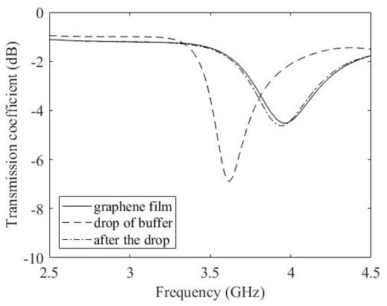 Without the graphene film, the ring resonator resonates at 2.5  GHz (Figure 3). After the introduction of the film, the ring resonates at around 4 GHz (Figure 4). Note that there is a variation in the mismatch due to the conductive behaviour of the film. The resonator is measured before and after the functionalisation of the graphene film. With the introduction of the graphene film, the transmission coefficient is slightly altered without significant variations (Figure 11).