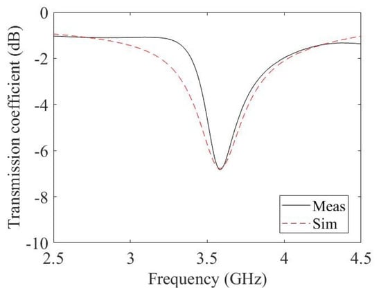 The circuital analysis performed in Section 3.2 resulted in an estimated value of the equivalent impedance of the film at the frequency of interest, i.e., 3.5  GHz. This value is ( 44 j 6.11 ) Ω . This estimated value of the sheet resistance of the film was used as a starting point for the finite element simulations performed with the help of Ansys HFSS. Since the film deposited on the resonator has a diameter of 5 mm and the gap is 2 mm wide; therefore, the lumped impedance is increased by a factor of AR (see Equation (2)) in the finite element models. The resultant estimated value of the film was thus ( 111.5 j 15.3 ) Ω / . With this value, the resonance of the film did not exactly correspond to the measured value. This is because many parasitic impacts resulting from the film are taken in to account in the finite element simulations. Therefore, an optimisation of the finite element simulations was needed. For the FEM simulation values to correspond exactly to the measured values, a sheet impedance of ( 120 j 10 ) Ω / was used. The resultant measured and simulated transmission coefficient of the resonator with the graphene film is shown in Figure 7.