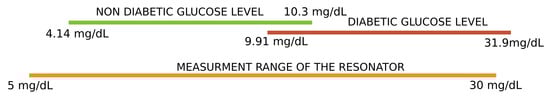 As indicated in [3], a non-diabetic person’s salivary glucose concentration is between 4.1  mg/dL and 10.3  mg/dL, while in the case of diabetic samples, the range is shifted to between 9.9  mg/dL and 31.9  mg/dL. Also, ref. [49] confirms that salivary glucose levels in diabetic subjects lie in the range from 10.00 mg/dL to 32.00  mg/dL. Differently, non-diabetic people’s levels span between 4.30  mg/dL and 12.90  mg/dL. Since the target of this work is to consider the detection of glucose in saliva, a range of glucose concentration of 5 mg/dL–30 mg/dL was chosen (Table 2). The dimension of the sensor, the size of the film, and the type of functionalisation are appropriately selected to cover this range (Figure 14).