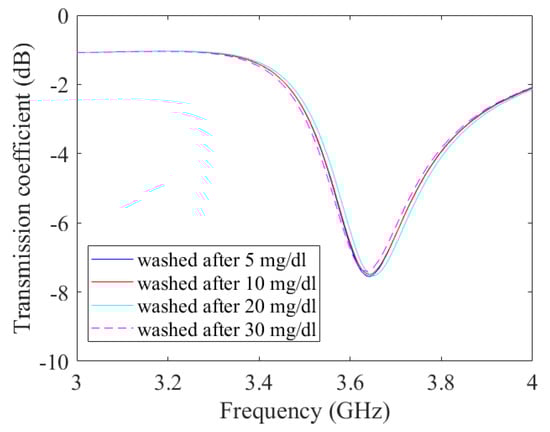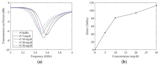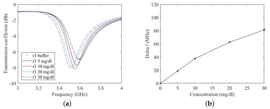 Each ring resonator is connected to an NA and two-port measurements of the transmission coefficient ( S 21 ) are performed in the frequency band 1 GHz–5 GHz. As the aim of this work is to quantify the variation of concentration of glucose in terms of the frequency shift of the ring resonator, drops with 20 μ L volume of different concentrations from 0 to 30 mg/dL are deposited on the functionalised film. The introduction of various concentrations of glucose over the film varies its impedance. This change in impedance results in a shift of the resonant frequency of the resonator. The resulting transmission coefficients of the ring resonator are shown in Figure 15a for prototype r3 and in Figure 16a for prototype r5. It can be seen from (Figure 15a) that, with a concentration of 10 mg/dL, the ring resonates at a frequency of 3.56  GHz. Increasing the concentration to 30 mg/dL shifts the resonant frequency to 3.52  GHz, corresponding to a shift in frequency of 40 MHz. Similarly, there is a shift in frequency of 20 MHz for the prototype r5 (in the 10 mg/dL–30 mg/dL concentration interval). Note that every time a drop of a different concentration is deposited on the film, the film is washed with a buffer solution. This shifts the resonant frequency of the ring back to its initial value.