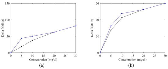In Figure 15b and Figure 16b, the measured frequency shift is reported as a function of the glucose concentration. For both prototypes, there is a change in the slope of the response at 10 mg/dL. The shift in frequency is greater in the case of prototype r5.