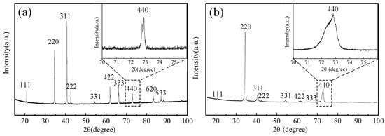 Figure 1a,b shows the XRD patterns of the powder sample and directionally solidified sample, with a typical RFe2 (R = Tb, Dy) Laves phase peak pattern. It can be seen that the main peak and secondary peak of the block sample are 220 and 440, respectively, and the peaks at other locations are small or hidden, which is typical of <110> preferred orientation. The error of crystal face spacing calculated by using high-angle peaks is smaller, so we focused on studying the 440 peak. The width of the 440 peak in the powder sample was only 0.5 degrees, while the 440 diffraction peak of the directionally solidified sample had a width of approximately 2 degrees, and its peak pattern was not a standard Gaussian peak pattern and was almost exactly the same shape as that reported in the literature [14,15,16]. The broadening of diffraction peaks in directionally solidified samples may be due to the superposition of diffraction peaks of two similar structures or to the large variation in the RFe2 phase crystal plane spacing. This paper considers the latter factor to be the main reason for peak broadening.