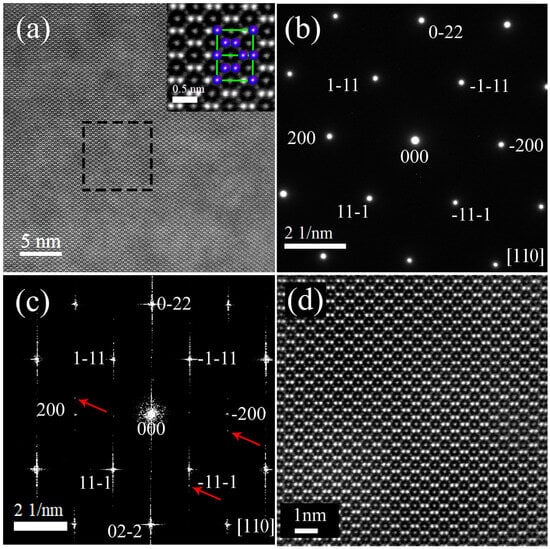 TEM has an advantage over XRD in characterizing the crystal structure in that the structure in specific microregions can be directly observed. To accurately characterize the location of atoms, STEM was performed on the sample. Figure 2a shows an aberration-corrected scanning transmission electron microscopy high-angle annular dark field (STEM-HAADF) micrograph of Tb0.29Dy0.71Fe1.95, and its selected area diffraction pattern has only one set of diffraction spots, as shown in Figure 2b, indicating a single-crystal structure. The region characterized by selected area diffraction is a circular region with a diameter of approximately 1 µm and includes the region shown in Figure 2a. The spots in both the selected area diffraction pattern and the Fourier transform pattern are indexed to the 110 crystal plane of the cubic structure. Figure 2c shows the fast Fourier transform (FFT) of Figure 2a, with an area of approximately 32 nm × 32 nm, obtained with Digital Micrograph software (https://www.gatan.com/installation-instructions, accessed on 7 March 2018). Figure 2c corresponds to a frequency pattern that represents information about the periodic structure in Figure 2a. The main spots indicate that the structure of the sample has a face-centered cubic arrangement. However, the irregular shape of the main spot and the satellite spots next to it (as indicated by the red arrow) indicate widespread lattice distortion in the sample.