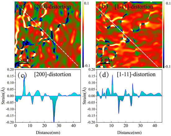 Taking the x-axis parallel to (200) (along the interface) and the y-axis parallel to (1–11), the strain fields along the x and y direction can be calculated using GPA. The strain field distribution characterized by GPA along the (200) and (1–11)-FCC directions is shown in Figure 3. Figure 3a,b gives information on the compression (depicted in blue) and expansion (depicted in yellow) of interplanar spacings of (200) and (1–11), respectively. There are regions where compressive strain and expansion strain are concentrated, and also regions where strain is gentle. Here, the tensile and compressive strains are interleaved and irregular. It was found that the compressive or expansion strain region in the strain field in the direction of (200) does not coincide with the regions in the strain field in the direction of (1–11), indicating that the increase or decrease in the distance between (200) crystal planes does not affect the change in the distance between (1–11) crystal planes. The crystal structure does not contract or expand uniformly but has independent disturbances at each lattice parameter. By calculating the distribution of in-plane strain along the line, the strain magnitude can be obtained quantitatively, as shown in Figure 3c,d. The strain variation range of (200) and (1–11) crystal planes is mostly between ±0.17 Å. Moreover, the curves at zero strain are smooth, that is, they are all first-order derivable, indicating that the positive and negative strains are continuously changing, and there is no step-like sudden change.