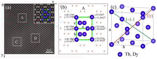 The light spots shown in Figure 2a are all Tb atoms and Dy atoms, excluding Fe atoms. The Fe atoms are not shown in the picture due to their small atomic number contrast. The atomic number of Dy is larger than that of Tb, resulting in a brighter atomic image through STEM. Tb elements with a lower atomic number are enriched in places with darker contrast, and Dy elements with a higher atomic number are enriched in places with brighter contrast. Therefore, the composition distribution (mainly referring to Tb and Dy atoms) of the sample is not uniform. Moreover, since the sample was homogenized annealed, the uneven distribution of Tb and Dy elements could not be eliminated by homogenizing annealing. The atomic number contrast in the STEM samples after 6 h of homogenization heat treatment is still obvious, indicating that long-term homogenization heat treatment can not completely eliminate the uneven distribution of Tb and Dy. A further zoom-in on the area inside the rectangle is shown in Figure 2d. The rare earth atoms (Tb and Dy) are clearly seen in the lattice of the crystal. As shown in Figure 2a,d, the sample has almost no defects, such as vacancies or interstitial atoms, and no obvious interface. The atoms are arranged in a regular uniform manner at their matrix positions, that is, there is only one set of lattices.