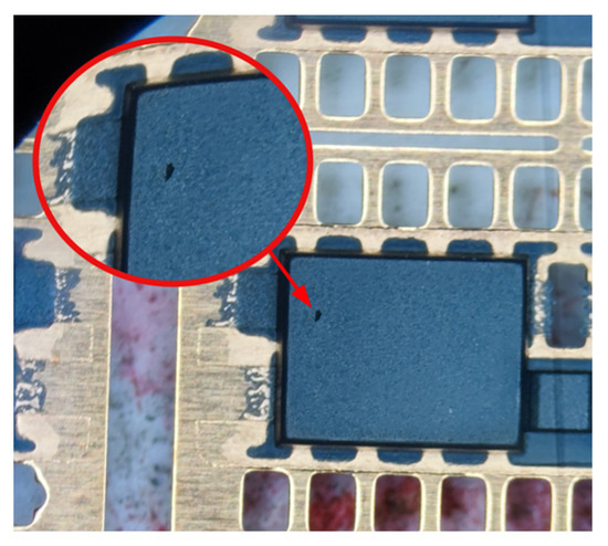 Three types of failure frequently occur in plastic packaging devices during actual production: warpage deformation, cavitation, and delamination. Warpage deformation refers to the deformation of the plastic packaging devices after the demolding treatment, mainly because of the unreasonable design of the injection mold or the mechanical properties of the material, which will reduce the reliability of the devices [8,9]. Cavitation refers to the phenomenon that there will be holes on the surface of the plastic packaging devices after the demolding treatment, which is because the air or moisture cannot be eliminated during the injection molding process of the equipment and remains in the cavity to become bubbles. Sink marks are the depressions and unevenness of the device surface. Sink marks are the heat-induced shrinkage of the plastic surface due to loss of pressure during the injection molding process. Voids are defects in the device that resemble vacuum bubbles. Voids are present because the bending strength of the device surface after cooling is greater than the stress strength of the internal contraction, and the device forms voids inside the shrinkage process. Sink marks and voids are the same, and they are collectively referred to as cavitation in this paper. The Venturi effect describes how the velocity of a fluid increases as the cross-section of the container it flows in decreases. As the fluid with the higher speed enters the smaller cross-section, it creates a vacuum and gives momentum to the other fluid [10,11,12]. The cavitation failure diagram is shown in Figure 1. Too many large cavitations will reduce the reliability of the devices. Delamination refers to the delamination phenomenon at the interface between the plastic layer and other materials of the plastic packaging devices, which can cause performance degradation or even failure of the devices [13].