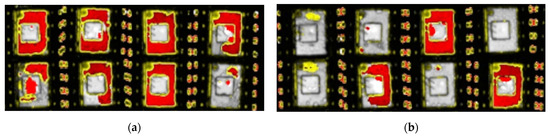 According to the data feedback from the cooperative enterprise and the third-party test report, the simulation scheme can improve the yield and reliability of plastic sealing devices. Figure 3a shows the acoustic sweep after the high-temperature steam test of the initial group, and Figure 3b shows the acoustic sweep after the high-temperature steam test of the optimization group.