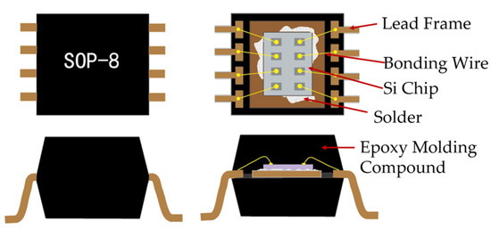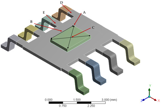 Solid Works (2019) was used to model the devices in 3D. The modeling part mainly includes a plastic shell, Cu lead frame, Si chip, and solder, which adopts the eutectic welding method to fix the chip on the lead frame [37]. Figure 4 shows the device’s structure diagram. Figure 5 shows the device dimensions.