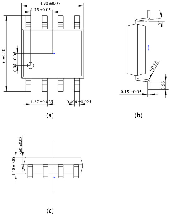 SOP-8 devices dimensions. (a) Front view; (b) Right view. (c) Top view.
