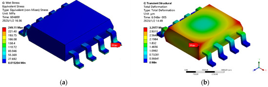 Wet stress and wet deformation diagrams of SOP-8 plastic packaging devices. (a) Wet stress diagram of SOP-8 plastic packaging devices; (b) Wet deformation diagram of SOP-8 plastic packaging devices.