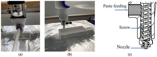 The Tronxy Moore 1 Mini Clay 3D printer (Shenzhen Tronxy Technology Co., Ltd., Shenzhen, China, Figure 2a,b) was selected for the potential printing of prepared ceramic paste. This printer used an extrusion method to print the ceramic paste, which was facilitated using a printhead comprising a screw and nozzle (Figure 2c). The printer can be adapted to print multiple materials using two printheads or utilizing two containers of ceramic paste. Ceramic paste was formed layer by layer to create multi-material samples both without and with interlayers. The printing parameters for TiO2 paste, which, with some modifications, can be used for printing ZrO2 paste or for printing multi-material samples, were as follows: layer height—1.5 mm; nozzle diameter—1.5 mm; nozzle speed—30 mm/s; and flow—100%. Subsequent works will investigate how the technological process affects the structure and properties of multi-ceramic samples.