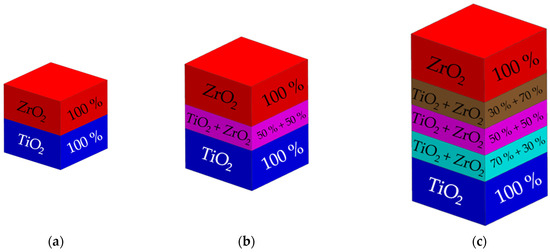 Three different types of multi-material TiO2/ZrO2 samples were considered: the MCS0—multi-ceramic samples without a interlayer (which contained 100 wt.% TiO2 and 100 wt.% ZrO2); the MCS1—multi-ceramic samples with one interlayer: 2-IL; and the MCS3—multi-ceramic samples with three interlayers: 1-IL, 2-IL, and 3-IL (Figure 3). Several options for pastes for TiO2 and ZrO2 ceramics with different mass contents of powder were considered. The pastes from the powder mixtures had the following content of ceramic powder: 1-IL—55 wt.%; 2-IL—60 wt.%; and 3-IL—65 wt.%. The multi-material TiO2/ZrO2 samples from ceramic pastes were sintered in a muffle furnace using the following regime: heating up to 240 °C at a rate of 10 °C/min, before holding for 1 h; heating up to 500 °C at a rate of 5 °C/min, before holding for 1 h; and heating up to 1400 °C at a rate of 10 °C/min, before holding for 2 h.