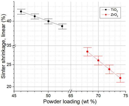 Based on information about the particle size distribution of TiO2 and ZrO2 powders and analysis of the results of the powder morphology (Section 2.1), it can be concluded that non-uniform linear shrinkage is possible after the sintering of multi-ceramic samples. Figure 4 depicts the outcomes of the linear shrinkage alteration in TiO2 and ZrO2 samples after sintering, based on the contents of ceramic powder in the pastes. Linear shrinkage for TiO2 ranges from 39 to 42%, while for ZrO2, it ranges from 22 to 28%. A linear relation can be observed in the variation in linear shrinkage based on the ceramic particle content in the paste, both for TiO2 and ZrO2 powders. For the last one, the shrinkage change is more pronounced. The findings reveal distinctions in linear shrinkage for different ceramics that were previously explained. Uneven shrinkage can lead to the formation of defects in the fabrication of multi-ceramic materials. To minimize this effect, it is important to select paste compositions with similar shrinkage values. For future investigations, the selected compositions comprised 50 wt.% TiO2 powder and 70 wt.% ZrO2 powder, which led to a 14% variation in the linear shrinkage. Secondly, it is worth considering the formation of interlayers in multi-ceramic samples. These layers should be close in linear shrinkage values to both TiO2 and ZrO2, as well as to each other.