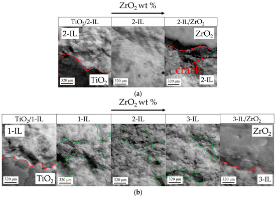 After sintering the multi-ceramic samples, it was found that the MCS0 had significant defects due to a too large difference in shrinkage and cannot be fabricated (this sample was not further investigated). On the other hand, the MCS1 and MCS3 samples exhibited fewer defects, and fabrication was feasible. It should be noted that partial sintering occurs in the interlayers. In this regard, there is no possibility of analyzing the interlayers using an optical microscope, and the studies were carried out using a stereomicroscope. Figure 5a illustrates that defects, specifically cracks, are present at the interface between TiO2 and ZrO2 ceramics and the 2-IL in the MCS1. These defects could be due to non-uniform shrinkage. Consequently, it can be concluded that using only 2-IL is insufficient for reducing differences in shrinkage, and it is more suitable to employ three interlayers, i.e., 1-IL + 2-IL + 3-IL. So, no cracks were observed at the interfaces in the MCS3. Interactions at the interface between the interlayers may cause alterations in concentration. An extensive investigation of the interface is required to study this phenomenon. It can be seen from Figure 5b that as the ZrO2 content increases, the degree of sinterability in the interlayers increases. This can be qualitative observed by the amount of material that is pitting (Figure 5b). This phenomenon can be explained by the fact that ZrO2 in 1-IL is unevenly distributed (presence of granules and particles) and presented in low quantities. Consequently, the ceramic materials that are not sintered with each other tend toward pitting. In comparison, 3-IL exhibits larger quantities of sintered ZrO2 and lower amounts of evenly distributed TiO2, which began to exhibit pitting.