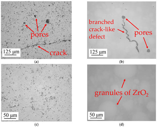The TiO2 and ZrO2 zones in MCS3 were analyzed for the presence of defects using an optical microscope. In the TiO2 zone, a small number of pores and cracks occur, while in the ZrO2 zone, though pores also occur, no cracks are present, but there are branched crack-like defects [33]. Pores may occur due to the presence of air bubbles in the paste, but their number can be reduced by degassing the paste (this step was not carried out in this work). Cracks may occur due to the insufficient amount of powder in the paste. Therefore, it is preferable to increase the TiO2 powder proportion to reduce the probability of crack formation. Branched crack-like defects develop at the boundaries of powder granules and are dependent on the granule’s size and shape, binder properties, and binder removal process [34].