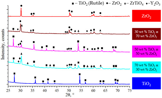 - Only TiO2 in the rutile phase is observed within the TiO2 zone, without any other phases being present. As ZrO2 content increased, the quantities of ZrTiO4 and TiO2 decreased, while that of Y2O3 increased. In the ZrO2 zone, no peaks of TiO2 and ZrTiO4 phases were observed, as well as the Y2O3 phase. Based on the chemical composition and phase analysis of interlayers, it appears that they contain sintered granules of ZrO2, which are enveloped by TiO2, ZrO2, and ZrTiO4 that have not been completely sintered.
