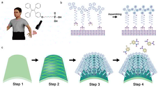 All reagents and chemicals were sourced from Sigma Aldrich (Saint Louis, MO, USA) and J&K (Beijing, China) and unless specifically stated, did not require additional purification before use. The reactions were performed using the conventional Schlenk technique within an inert argon atmosphere, utilizing anhydrous solvents. The heavily doped n-type silicon wafers underwent an initial cleaning in a Piranha solution (sulfuric acid to hydrogen peroxide volume ratio of 70:30), followed by heating at 110 °C for two hours, a thorough rinse with deionized water, and an RCA clean (a mixture of deionized water, ammonium hydroxide, and hydrogen peroxide in a volume ratio of 5:1:1), before being dried with nitrogen gas for immediate use. Fibers in PMMA solution were spin-coated on the PET substrate forming the complex interleaved network. A 10 nm thick film of Al2O3 was deposited using the ALD system at 200 °C after 110 cycles. Before the growth of SAMs, flame treatment was employed to strip organic adhesives and other contaminants from the samples. Then, Al2O3-coated wafers/fiber samples were immersed at room temperature in a 0.1 mM TPE-PA-8 solution in tetrahydrofuran (THF) for 24 h under an argon atmosphere to form the SAMs. After incubation, substrates were ultrasonically treated in THF and ethanol, each for 5 min in three cycles, to remove any surface-adsorbed species. They were then dried with nitrogen gas and stored in a glovebox for subsequent use.