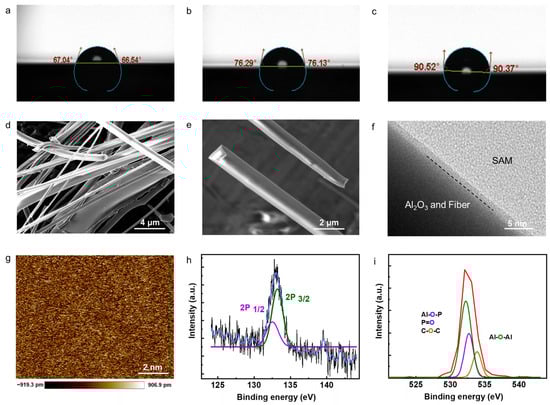 The contact angle observation of (a) bare substrate with Al2O3 layer and SAM-coated substrate at the time of preparation (b) and after 24 h aging (c). SEM images of the Al2O3-coated fiber film at low (d) and high (e) resolution. (f) HRTEM image of the interface between Al2O3/fiber and SAM layers. (g) AFM image of SAMs layer. (h) High-resolution XPS of P 2p and (i) O 1s.