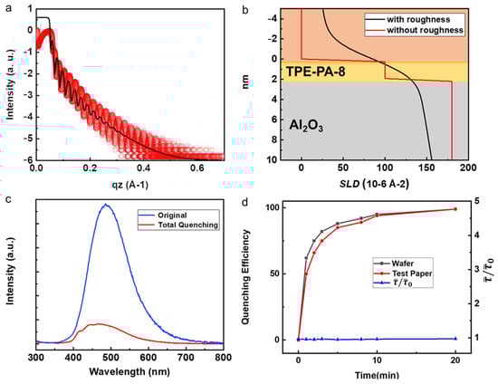 (a) XRR plots of the SAM sensor (red dots) and the corresponding fitting curve (black curve). (b) Scattering length density (SLD) profile with (black curve) and without roughness (red curve). (c) The fluorescence spectra detected before and after PL quenching. (d) Time-dependent PL quenching efficiency and lifetimes of SAMs on hard wafer and flexible fiber substrate.