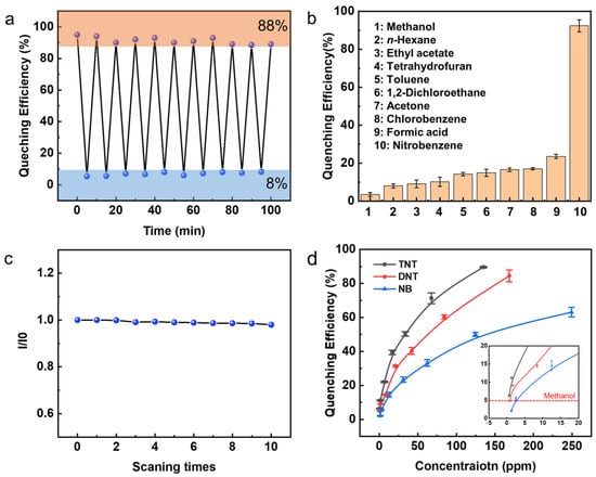 (a) TPE-PA-8 SAMs reversibility tests performed 20 times. (b) Selectivity tests for the TPE-PA-8 SAMs over 10 different materials. (c) The peak fluorescent efficiency (I/I0) stability over scanning times. (d) Concentration-dependent quenching of TPE-PA-8 SAMs for the NACs. Inset shows the enlarged view of quenching efficiencies at low concentrations.