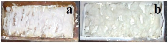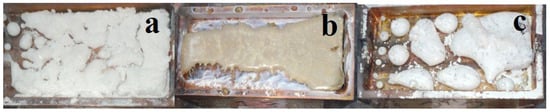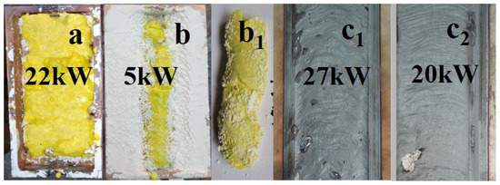 During the radiation treatment of the mixture in the crucible, a zigzag-shaped ceramic plate forms across the entire area. Examples of the synthesized samples in the crucible are shown in the photographs in Figure 4. The samples resemble solidified melt. The formation of spinel ceramic samples occurs over a wide range of power densities used, ranging from 15 to 25 kW/cm2, in the R1 mode. The samples are brittle, and their brittleness decreases with an increase in power density.