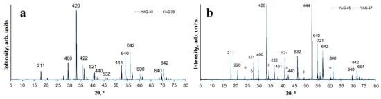 Diffraction patterns of YAG samples: (a) 1 (solid line) and 2 (dotted line); (b) 3 (solid line) and 4 (dotted line). Reflexes belonging to accompanying phases are marked with the symbol ◊.