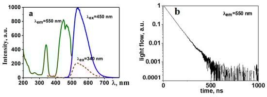A cycle of research on the luminescent properties of synthesized YAG: Ce ceramics has been conducted, including photoluminescence (PL) and cathodoluminescence (CL) spectra under stationary conditions using the Cary Eclipse spectrofluorimeter for excitation and time-resolved cathodoluminescence spectra utilizing a pulsed electron accelerator with an energy of 250 keV [30]. In a generalized form, the spectral–kinetic properties of the obtained YAG: Ce ceramic are depicted in Figure 3b.