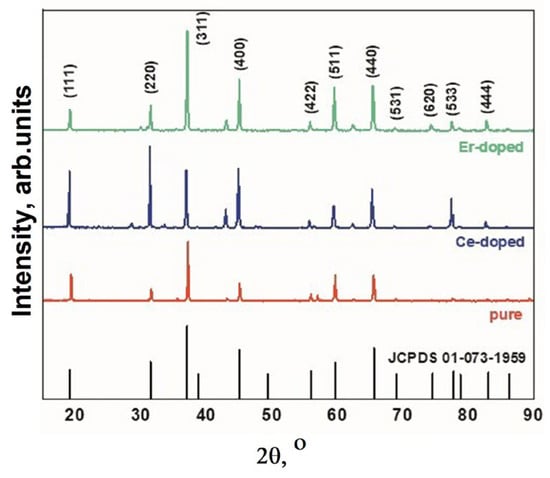 XRD spectra of MgAl2O4 spinel, pure and doped Ce and Er ions.