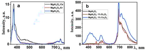In the photoluminescence spectra (Figure 6a), an intense emission band is observed in the UV region, along with broad emission in the “red” region of the spectrum. Under electronic excitation, the dominant emission in the spectrum is the “red” emission, both for pure and activated spinel samples. Additionally, there are bands with maxima at around 410 and 520 nm, and their intensity depends on the type of doping impurity. The emission in the region with λmax = 380 nm may be associated with F-centers in the spinel structure. The emission band in the 700–760 nm range is attributed to oxygen vacancies. A characteristic feature of spinel is the emission of chromium ions, which appears as a set of narrow bands in the 700 nm region [36]. As evident from the presented results, the qualitative characteristics of luminescence are similar to well-known ones [37,38]. In this manner, in the synthesized MgAl2O4 ceramic, crystallites with a spinel-like structure are formed.