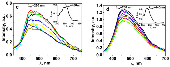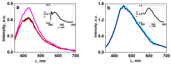 A series of studies on the luminescent properties of W-activated samples of synthesized ceramics BaF2, MgF2, BaMgF4 was carried out: photoluminescence (PL) excitation and emission spectra in stationary conditions using the SM2203 SOLAR spectrometer. In a generalized form, the spectra are presented in Figure 8. The figures present the results of spectral measurements of fluorescence from individual sections of the sample to demonstrate the homogeneity of properties. The inserts in the spectra show the excitation spectra of luminescence. The spectra highlighted in different colors in the graph (Figure 8) indicate that the spectra of the same sample from different regions are highlighted in different colors.