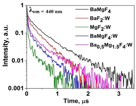 Kinetic decay curves were measured following excitation of cathodoluminescence using electron beam pulses with an energy of 250 keV and a duration of 10 ns. The measurement results are presented in Figure 9. In all activated ceramic samples, the appearance of a short-lived component is observed.