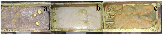 Photographs of activated W samples of BaF2 (a), MgF2 (b), and BaMgF4 (c) ceramics synthesized under the influence of an electron beam with E = 1.4 MeV, P = 15 kW/cm2, R1.