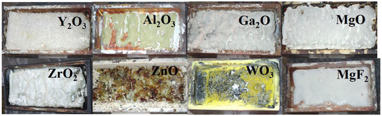 Fluorides of alkaline earth metals (MeF2) and their solid solutions have been utilized as scintillation materials [39,40,41]. The synthesis of ceramics based on alkaline earth metal fluorides (MeF2) is of interest for several reasons. The activation of crystals by multivalent ions makes them sensitive to the effects of ionizing radiation. However, introducing the most interesting ions for increasing sensitivity, such as W and U, is hindered by the fact that in a fluoride environment at temperatures of 20–60 °C, these ions form volatile compounds and are removed from the medium. Therefore, additives capable of retaining W and U ions in the melt are introduced into the crucible for the synthesis of such compounds. Incorporating hexavalent ions W and U into the lattice is complicated by the need to balance the charge difference, which can be resolved by using solid solution matrices, such as BaMgF4. Finally, the melting temperatures of MeF2 are 1.5–2 times lower than those of metal oxides. This is of interest in understanding synthesis processes in a radiation field. It can be expected that at a high rate of radiation synthesis, the activator ions will not have time to exit the ceramic formation zone [42].