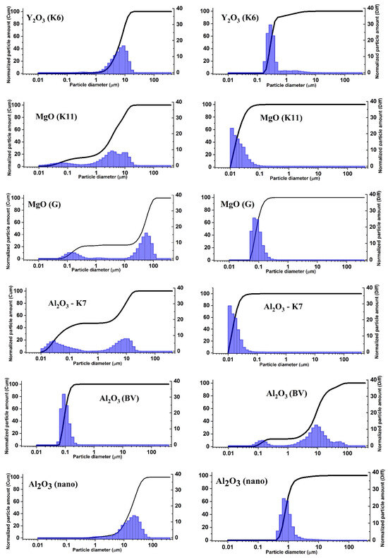 It is evident that the requirements for the initial materials vary depending on the use of different technologies. For instance, in thermal synthesis, the efficiency of synthesis (time, quality) is higher when the precursor particle sizes are smaller. Smaller particle sizes increase the likelihood of element exchange between particles. In radiative synthesis, the formation of new structures occurs in the electron-ion plasma created by a powerful stream of high-energy radiation. Therefore, it is necessary to investigate the dependence of the results of radiative synthesis on the properties of the initial substances. In [28], when studying the dependence of the efficiency of radiation synthesis on the history of the initial material, it was found that the synthesis outcome is significantly influenced by the dispersed composition of the substances used for synthesis. This dependence has a greater impact on the synthesis outcome than the degree of their purity. We conducted a series of studies aimed at investigating the dependence of the efficiency of radiation synthesis of ceramics based on metal oxides and fluorides on the particle sizes of the initial powders.