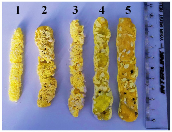 Therefore, according to the presented understanding of ceramic synthesis processes under the influence of high-energy electron beams, there should be a threshold power density Pc for each material above which the process of forming a new phase or morphology becomes possible. Knowledge of this threshold is crucial for understanding the dependence of synthesis efficiency on the energy and morphological properties of the initial materials. At present, it seems reasonable to adopt the following approach to determine Pc: during synthesis in the R2 mode, a rod-shaped sample is formed in the layer. As the power density P decreases, the cross-sectional area of the sample decreases until it reaches a certain value. Below a certain P, the sample becomes discontinuous, but the dimensions of its cross-section remain the same (Figure 18). In the synthesis of YAG samples, the minimum diameter of the sample reaches 4–5 mm, with a minimum length of 10 mm. With further reduction in P, ceramic formation is not observed. This value should be considered as the threshold.