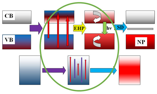 Therefore, the main distinction between the energy dissipation processes of electronic excitations in dielectric and metallic materials lies in the existence of short-lived radiolysis products in dielectric materials. In metals, there are no processes associated with the decay of electronic excitations into pairs of defects or the formation of radicals—mobile intermediate components capable of participating in structural transformations during their existence.