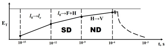 The transformation of structural phases after exposure to a radiation flux occurs with the heating of the irradiated material. Figure 20 schematically represents the dependence of the amount of energy transferred to the material’s heating during the relaxation of electronic excitations and structural phase transformations. At least half of all absorbed radiation energy is transferred to the lattice during the relaxation of created electronic excitations to their lowest states in a time period of τ = 10−12 s. The creation of primary short-lived defects occurs with the transfer of a portion of the energy from relaxed electronic excitations, excitons, to the lattice within a time period of τ = 10−9 s. This portion can constitute approximately half of the exciton’s energy. Primary defects transform into stable radicals, which form a new phase within timescales of τ = 10−3 s. Transformations of stable radicals are also possible within timescales of τ = 103 s.