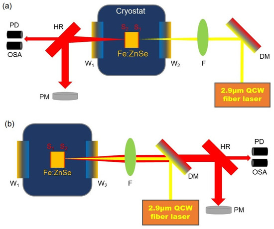 Experimental schematic diagram of Fe: ZnSe laser. (a) Forward pump; (b) backward pump. PD: photoelectric detector; OSA: optical spectral analyzer; PM: power meter; F: focusing lens; DM: dichroic mirror.