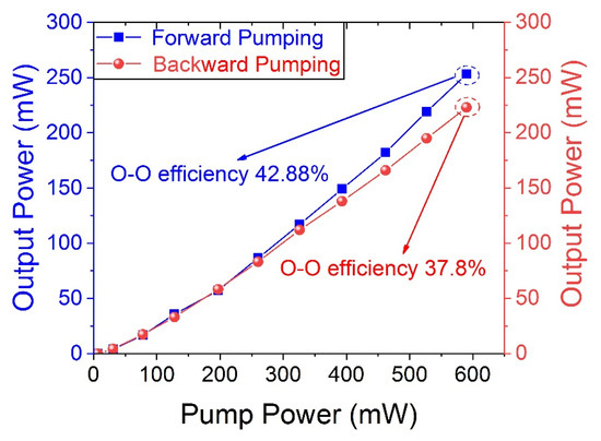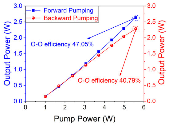 The characteristics of the laser were tested in the CW regime, including the output power of different pump structures shown in Figure 3. The blue square represents power when the forward pump is used, while the red spot represents power excited by the backward pump. As the power of the pump source increases, the output power is enhanced without a trend of saturation. The two lines grow linearly until the peak value. The highest output power of the blue line is 2.63 W with an efficiency of 47.06%. As for the red line, the value of output power has a maximum of 2.28 W and an efficiency of 40.79%. The efficiency is defined as the ratio of power measured by PM and quasi-CW fiber laser output power. Comparing the two lines, it is obvious that the forward pump is more advantageous than the backward pump as the perspective of output power when pump power is over 3 W. There is no clear distinction between these two lines excited by the low pump. The reason why the difference is caused, we assume, is that two factors contribute to the result. The pump light enters the crystal through the front face, S1, which is HR-coated at 2.6~3 μm. Less pump energy is lost when a forward pump is built. On the contrary, in the structure of the backward pump, as shown in Figure 1b, the output laser has more loss, propagating through one more focusing lens and the DM. The ultimate total output power is lower.