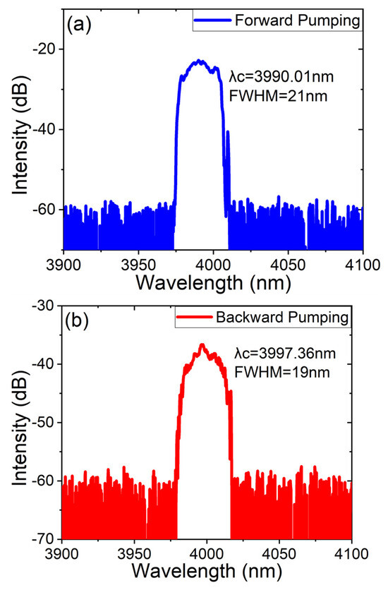 Not only was power measured, but the spectra were analyzed, as shown in Figure 4. In Figure 4a, the time of the highest output power excited by the forward pump is drawn using OSA. Similarly, Figure 4b shows the spectrum acquired from the backward pump. From the spectra, it can be seen that the wavelength of the laser output is centered at 4 μm, consistent with the emission spectrum of the Fe: ZnSe crystal. The results show that conversion between wavelengths occurred. The central wavelength is 3990.01 nm with an FWHM of 21 nm in the forward structure while the central wavelength is 3997.36 nm with an FWHM of 19 nm in the backward structure.