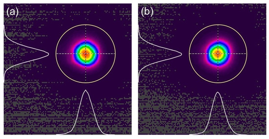 At the same time, we recorded the beam profile of the laser via MIR charge-coupled devices (CCD), as shown in Figure 5. The data were detected when output power was at maximum. Figure 5a shows the intensity distribution of the Fe: ZnSe laser beam when the forward pump is utilized. As for the backward pump, Figure 5b shows the result. The beam quality is good, which can be approximately regarded as the TEM00 mode. It can be seen that under the structure of the two pump methods, the beam quality demonstrates good performance, which can be approximately regarded as the TEM00 mode from the figures. In addition, the energy of the optical spot is in Gaussian distribution.