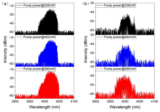 Spectra are also depicted in Figure 7 at different pump powers. Figure 7a shows the results of the forward pump while Figure 7b shows the backward pump. As with the CW output, the central wavelength still peaked at ~4 μm. The wavelength of 2.9 μm is transferred to the laser of MIR. As pump power increases, the spectrum widens. When pump power is the highest, the central wavelength is 4020.71 nm with 23 nm FWHM in the forward pump, and 3992.15 nm with 40 nm FWHM in the backward pump.