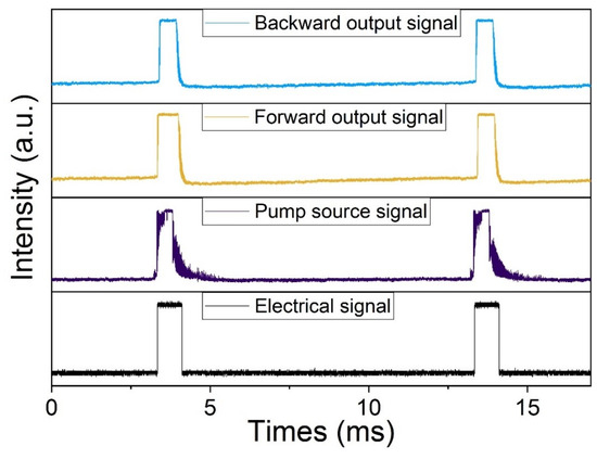 The waveforms of different signals are given in Figure 8. The black line is the modulation signal which is a square wave with a frequency of 100 Hz, duration ratio of 10%, and 1 ms pulse width. The purple line shows the pump waveform at the maximum output. The yellow line represents the waveform of the Fe: ZnSe laser in the forward structure. The parameters are measured as a frequency of 99.1 Hz, pulse width of 0.78 ms, and energy of 2.55 mJ. The blue line indicates the waveform of the Fe: ZnSe laser in the backward structure. The parameters are measured as a frequency of 100.3 Hz, pulse width of 0.67 ms, and energy of 2.22 mJ. It can be seen that whatever structure is fabricated, the Fe: ZnSe laser can maintain a square wave output with a frequency of around 100 Hz.