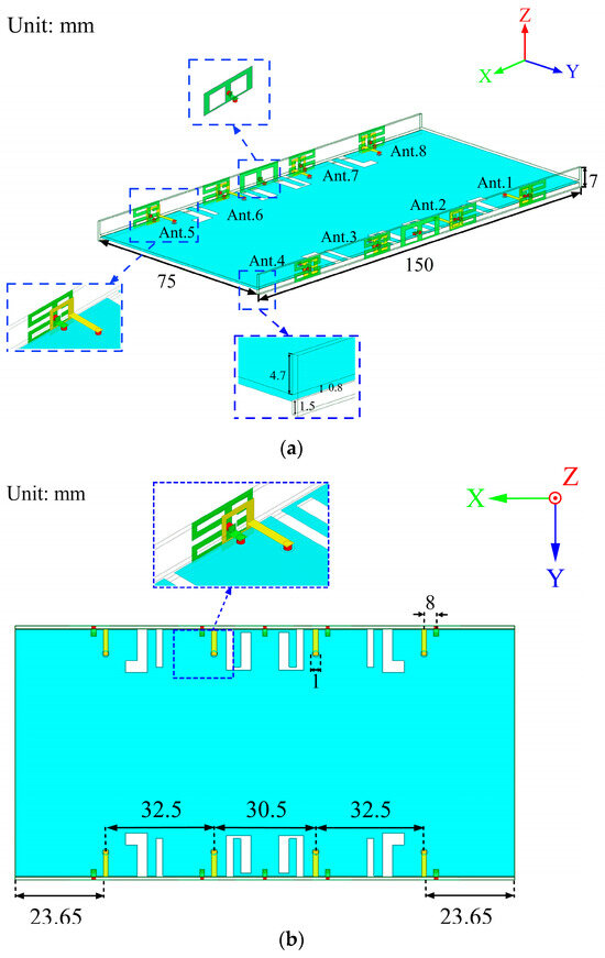 The detailed design and geometric structure of the proposed eight-element dual-band antenna array for 5G mobile phones are shown in Figure 1. The substrate of the two frames and the system board is FR4, with a thickness of 0.8 mm, a relative permittivity of 4.4, and a loss tangent of 0.02. The size of the system board and two long frames is 150 mm × 75 mm × 0.8 mm and 150 mm × 7 mm × 0.8 mm, respectively. The overall size of the presented antenna system meets the general dimension requirements of 5G mobile phones. As shown in Figure 1a, the distance between the bottom of the frames and the system board is 1.5 mm. The feed line is fed by a coaxial cable from the via on the ground plane. There are four antenna elements on each frame, and the distance between Ant. 1 and Ant. 2 is 32.5 mm, while the distance between Ant. 2 and Ant. 3 is only 30.5 mm. The distance between Ant. 3 and Ant. 4 is the same as the distance between Ant. 1 and Ant. 2. The four antenna elements (Ant. 5 to Ant. 8) on the other frame also present a symmetrical structure. Ant. 1–Ant. 4 and Ant. 5–Ant. 8 are symmetrical about the central axis. Each antenna element consists of a radiator and a parasitic unit, as shown in Figure 2. The parasitic unit is printed on the outer surface of the mobile phone frame, which is composed of an inverted H-shaped and four L-shaped patches. The radiator is printed on the inner surface of the mobile phone frame, which is a rectangular ring. In addition, the radiator is connected to the feed line with a width of 1.5 mm and a length of 8 mm. The parasitic unit is connected to the ground through the vias. To improve the isolation between the two antenna elements in the middle of each frame, a back-to-back placement and additional isolation units are used in this paper. In Figure 2c, the overall dimension of the isolation unit is 17.65 mm × 7 mm, which has two rectangular slots of 5.83 mm × 5 mm. One isolation unit is printed between Ant. 2 and Ant. 3 on one frame, while the other isolation unit is printed between Ant. 6 and Ant. 7 on the other frame. The isolation unit can attenuate the influence of the coupling between the antenna elements, thus achieving a better isolation effect.
