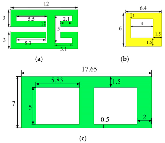 Geometry of the proposed antenna element: (a) parasitic unit; (b) radiator; (c) isolation structure.