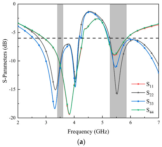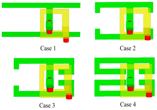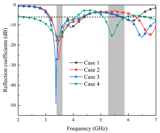 Several structures and corresponding S-parameters in the antenna design process are shown in Figure 5 and Figure 6. The vias connected to the parasitic units and the feed lines are represented by red cylinders in Figure 5. As depicted in Figure 6, the −6 dB impedance frequency band of the Case 1 antenna is 3.1–4.33 GHz, which covers the n78 frequency band. However, the higher-frequency band does not meet the design requirements. In addition, the horizontal strips are too long, and the coupling effect between the antenna elements is relatively strong. The lower-frequency characteristics of the Case 2 antenna meet the design requirements, and the bandwidth of the higher-frequency ones is optimized. However, the resonant frequency of the higher-frequency band is far from 5.5 GHz. To optimize the resonant frequency of the higher-frequency band, Case 3 is designed. The resonant frequency of the higher-frequency band is decreased to 6.48 GHz. To further optimize the resonant frequency of the higher-frequency band, the Case 4 antenna is proposed. In this model, a rectangular strip is added to the right patch. The resonance point of the higher-frequency band reaches 5.49 GHz. In addition, the frequency band of the antenna covers n78 (3400–3600 MHz) and WLAN (5275–5850 MHz), which meets the design requirements.