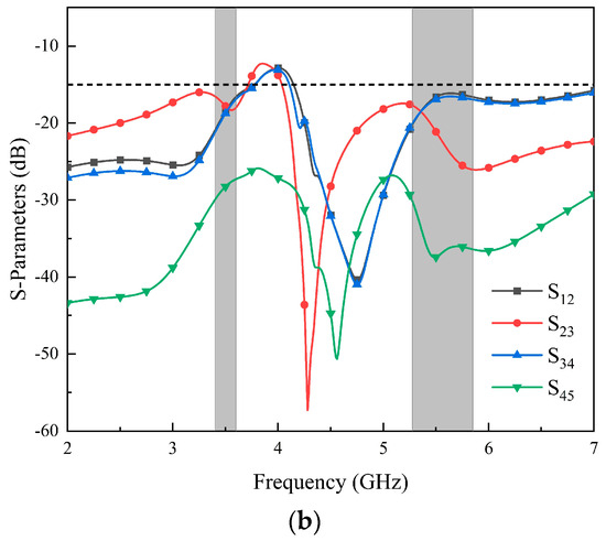 The S-parameters of the MIMO antenna without the isolation structure are illustrated in Figure 8. It can be observed that the return loss of the MIMO antenna without isolation structure can cover the n78 (3400–3600 MHz) and WLAN band (5275–5850 MHz). However, the isolation is lower than 15 dB in both frequency bands.