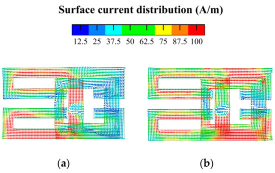 The surface current distributions of antenna elements at different frequencies are shown in Figure 7. At 3.5 GHz, the current is mainly concentrated on the left side of the external patch, while the current distribution of the right patch is weaker. At 5.5 GHz, the current on the patch is mainly concentrated on the right side, while the current distribution on the left side is relatively weak.