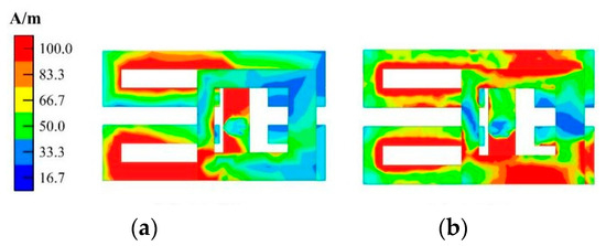 Current distribution without isolation structure at different working frequencies: (a) 3.5 GHz; (b) 5.5 GHz.