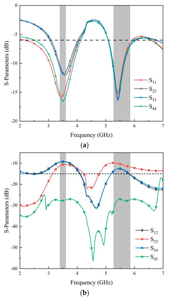 The S-parameters of the MIMO antenna with an isolation structure are illustrated in Figure 9. The isolation structure includes the reduction in the ground radiation patch and the addition of isolation cells. As seen in Figure 9, the return loss of the MIMO antenna is optimized and extended in frequency bands less than −6 dB after the addition of the isolation unit. The isolation of the antenna is larger than 15 dB in the required operating band. Therefore, the frequency band of the proposed MIMO antenna can cover n78 (3400–3600 MHz) and WLAN (5270–5850 MHz) frequency bands, and the simulated return loss and isolation meet the design requirements.